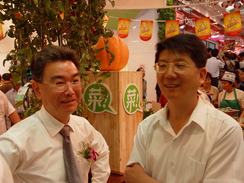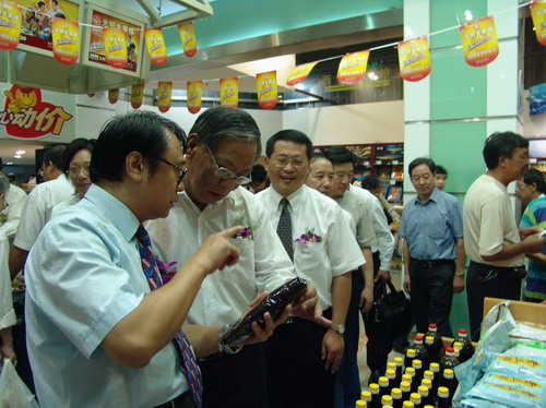 (光明集團(tuán)總裁曹樹民和光明集團(tuán)董事、上海煙糖集團(tuán)公司董事長(zhǎng)吳順寶參觀光明食品節(jié))