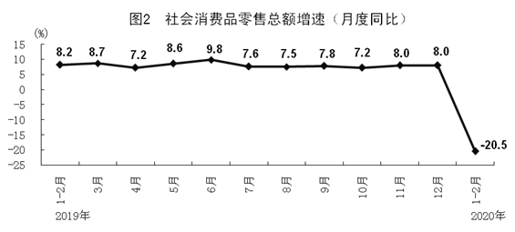 根據(jù)第四次全國經(jīng)濟普查結(jié)果對2019年社會消費品零售總額進行了修訂,2020年1-2月份增速按照可比口徑計算。