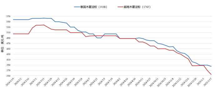 圖2 2024年1月份以來(lái)泰國(guó)、越南木薯淀粉外盤(pán)價(jià)格變化情況