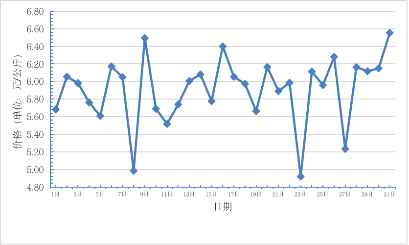 3月,全國重點監(jiān)測農產品批發(fā)市場香蕉交易量 2.3萬噸、交易值 17619.3萬元。日平均價格最高為6.5元/千克,最低為5元/千克,全月平均價格為 5.9元/千克,同比上漲11.3%,環(huán)比下降9.2%(每日價格變化如圖)。