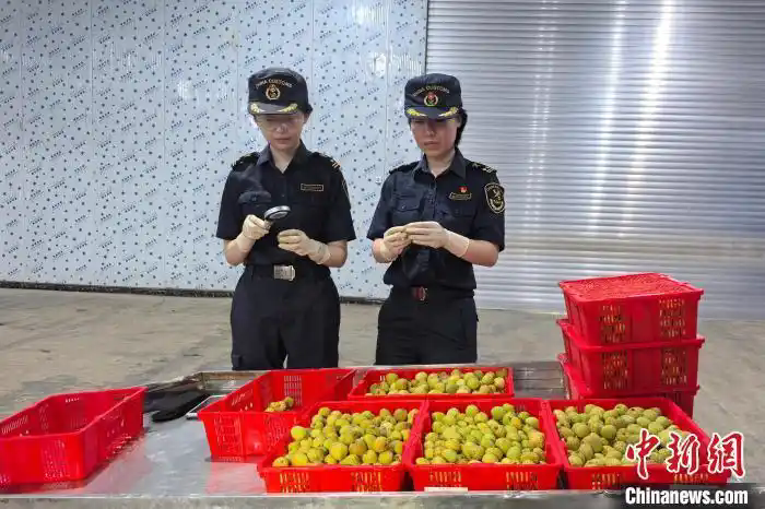 海關(guān)工作人員對今年茂名首批出口荔枝進行查驗。湯柏生 攝