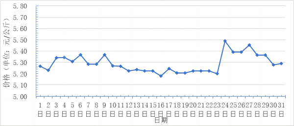 3月,全國重點(diǎn)監(jiān)測農(nóng)產(chǎn)品批發(fā)市場香蕉總交易量達(dá)2.7萬噸,同比下降3.6%,環(huán)比增長42.1%;總交易價值14303.7萬元,同比下降27.7%,環(huán)比增長43.48%。日平均價格最高為5.5元/千克,最低為5.2元/千克,全月平均價格為5.3元/千克,同比下降17.2%,環(huán)比基本持平(每日價格變化如圖)。