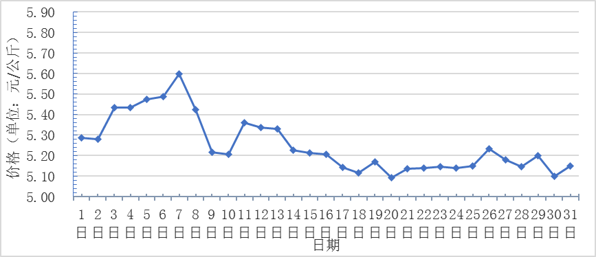 1月,全國重點(diǎn)監(jiān)測農(nóng)產(chǎn)品批發(fā)市場香蕉總交易量達(dá)2.4萬噸,同比增長26.3%,環(huán)比下降14.3%;總交易價(jià)值20640.1萬元,同比增長66.6%,環(huán)比增長22.4%。日平均價(jià)格最高為5.6元/千克,最低為5.1元/千克,全月平均價(jià)格為5.3元/千克,同比下降14.5%,環(huán)比下降8.6%(每日價(jià)格變化如圖)。
