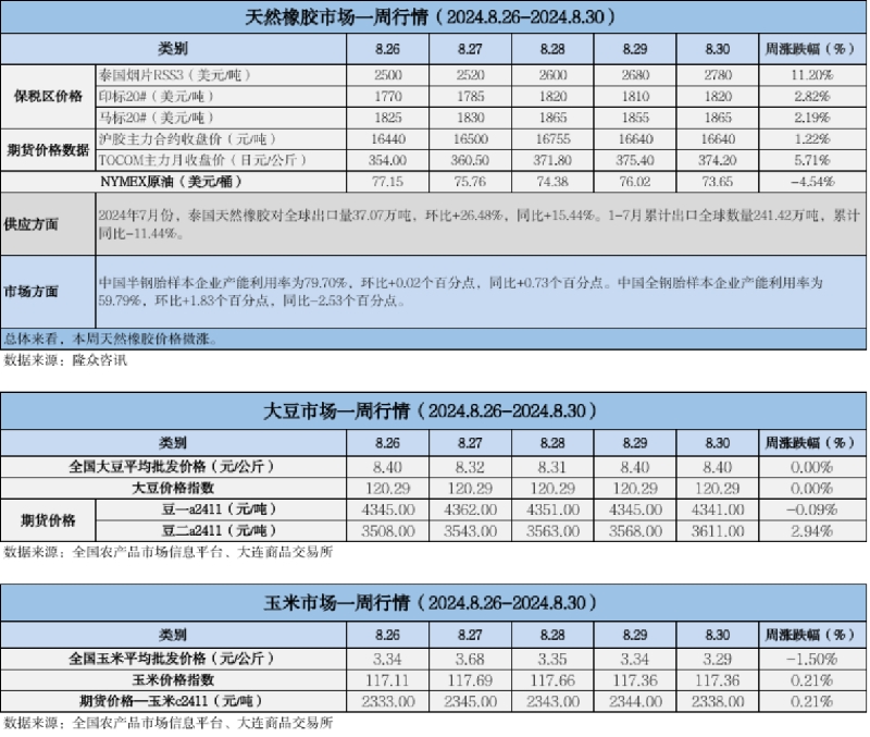 天然橡膠、大豆、玉米市場(chǎng)一周行情(2024.08.26-08.30)