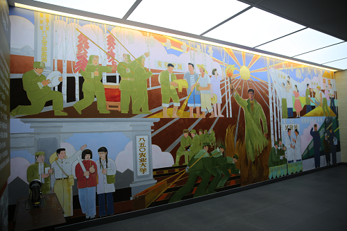 第一展廳,主題是傳承紅色基因。采用紅色色調(diào),展示了自制定開發(fā)北大荒的戰(zhàn)略決策起,到黑龍江生產(chǎn)建設(shè)兵團(tuán)時期的發(fā)展歷程。主要展品有:半景畫“英雄的足跡”、微縮景觀“艱難建場”、大型壁畫“九個第一”(右圖)、鐵道兵軍品等。
