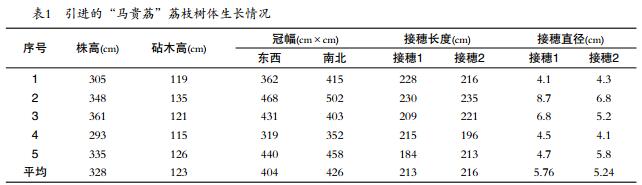 引種4年后,“馬貴荔”荔枝平均株高328cm,砧木高123cm,冠幅(東西×南北)404cm×426cm,平均接穗長度分別為213cm和216cm,平均接穗直徑分別為5.76cm和5.24cm(表1)。
