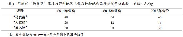 2014—2016年,引進的“馬貴荔”荔枝平均銷售價格分別為40元/kg、30元/kg和40元/kg。與瀘州地區(qū)主栽品種和晚熟品種相比,2014年引進的“馬貴荔”荔枝平均銷售價格為“大紅袍”荔枝的2.0倍、“楠木葉”荔枝的1.3倍;2015年引進的“馬貴荔”荔枝平均銷售價格為“大紅袍”荔枝的2.5倍、“楠木葉”荔枝的1.5倍;2016年引進的“馬貴荔”荔枝平均銷售價格為“大紅袍”荔枝的2.5倍、“楠木葉”荔枝的1.3倍??梢姟榜R貴荔”荔枝引進瀘州后,連續(xù)3年銷售價格高于當?shù)刂髟缘摹按蠹t袍”荔枝和當?shù)赝硎斓摹伴救~”荔枝。