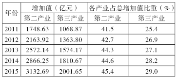 《中國農(nóng)墾統(tǒng)計年鑒》顯示,從2011年至2015年,農(nóng)墾系統(tǒng)二三產(chǎn)業(yè)增加值持續(xù)上升,2014年起第三產(chǎn)業(yè)的增加值占比超越了第一產(chǎn)業(yè)。詳見表1。